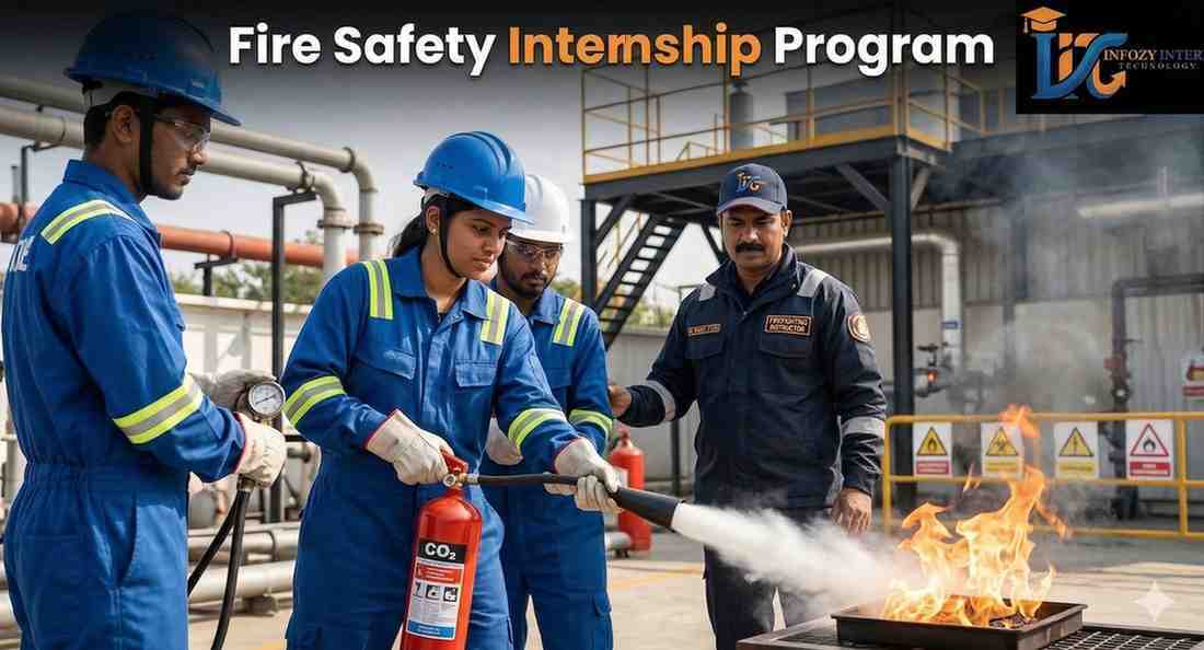 Infozy Intern Technology offers a specialized Fire Safety Internship Program designed to provide practical knowledge and hands-on training in fire prevention, safety management, and emergency response. This program helps students and trainees understand real-world safety standards and prepares them for careers in industrial, commercial, and safety sectors.